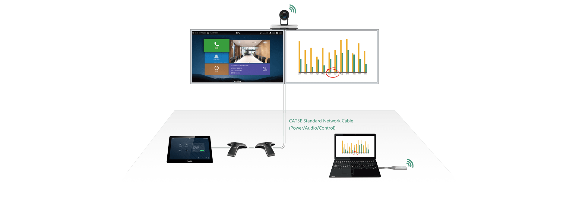 The VC800 multi-camera solution enables up to 9 cameras to work at the same time. You can control each camera separately, put all cameras in one picture, or set certain picture larger/full screen. The deployment is simple by connecting VC800 and VCC22 cameras to PoE switch only with Ethernet cables, no need for extra power supplies for VCC22, or extra video matrix.
